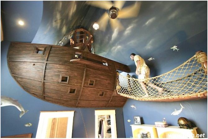 海盜船造型設(shè)計(jì),很難想象吧!有時候,我們只會想到豪華汽車有汽車模型、奢華飛機(jī)有飛機(jī)模型,但我們卻沒有想到將這些模型運(yùn)用到臥室內(nèi)。而這款設(shè)計(jì),設(shè)計(jì)師充分發(fā)揮了想象力,將電影情節(jié)中的海盜船造型運(yùn)用到了居室內(nèi),天馬行空的想象讓我們佩服。這個海盜船造型的臥室設(shè)計(jì)最大的亮點(diǎn)就是有一個超級熱愛航海的航海員的家,整個家都充滿了海洋的元素,例如家中的壁紙都具有海洋的味道。在這里,還可以是小孩子的游樂場所,需要特別注意的是,登上這艘海盜船一定要注意安全,特別是小孩子。