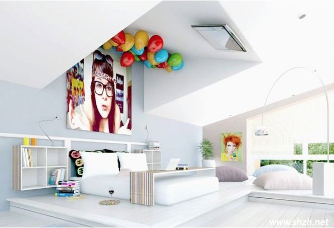 也許,一看到這個設(shè)計(jì),你也一定會很驚訝,電視機(jī)居然被掛到了天花板上,讓純白單調(diào)的天花板變得不再寂寞。臥室背景墻的設(shè)計(jì),彩色的氣球給整個區(qū)域增添了許多亮麗的色彩,而且臥室空間變得趣味十足,不再單調(diào)乏味。