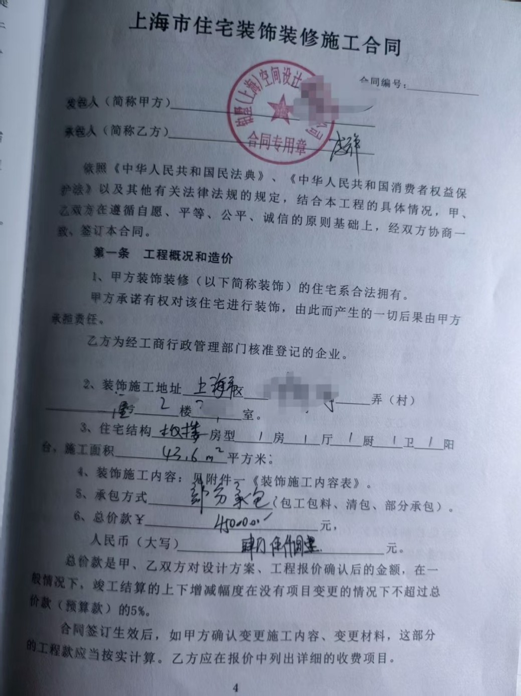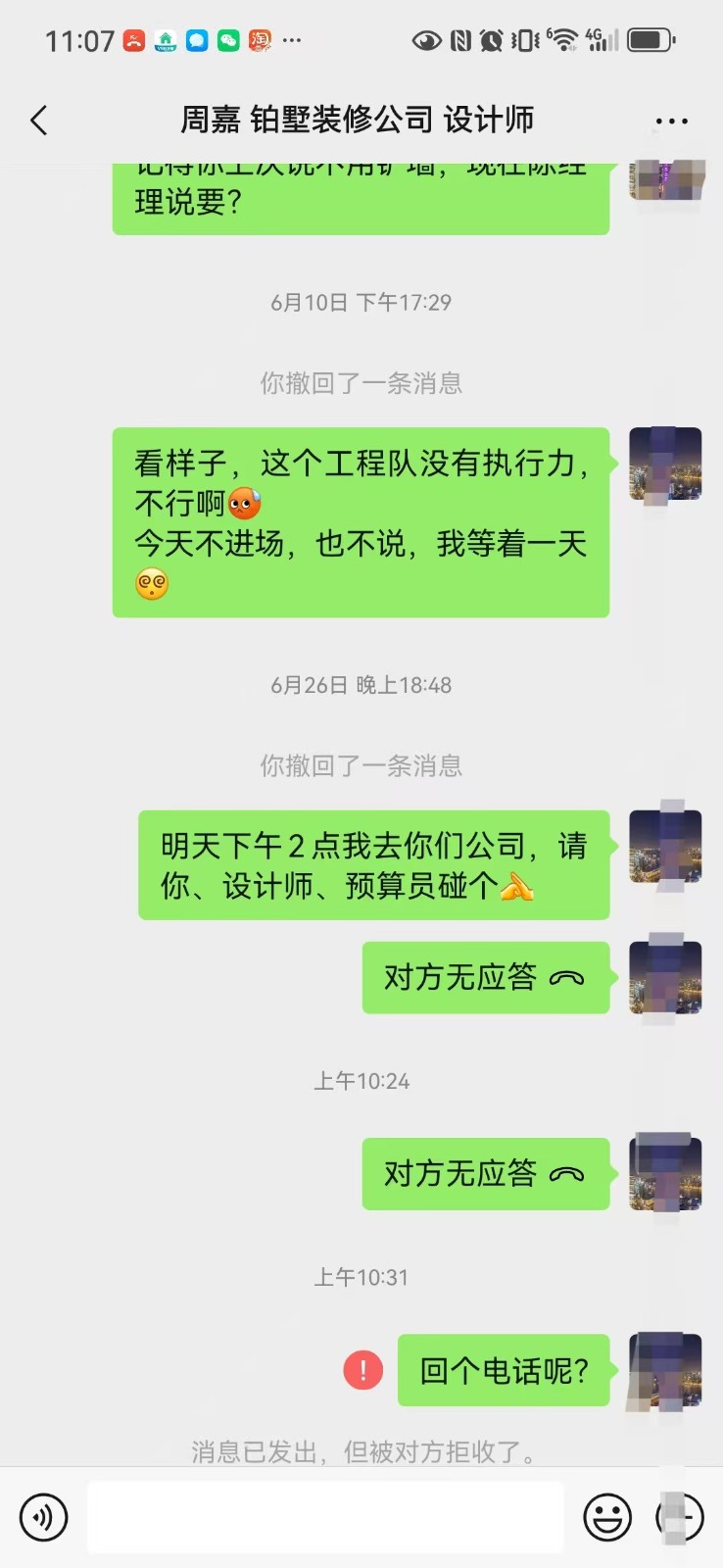 2025年3月23日簽合同前,鉑墅(上海)空間設計裝飾有限公司設計師、簽約人周嘉說得天花亂墜,稱全部設計項目工程量都已包括在預算報價內(nèi),絕對不會有增加項目、隱形收費,業(yè)主的裝修當自己家里事做。建群開工后,設計師就開始玩躲貓貓,打電話也接,發(fā)信息也不回,群里@也不理,去辦公室交流設計方案也沒有人,只見他的頭像還在群里,微信不回,還給我拉黑了。