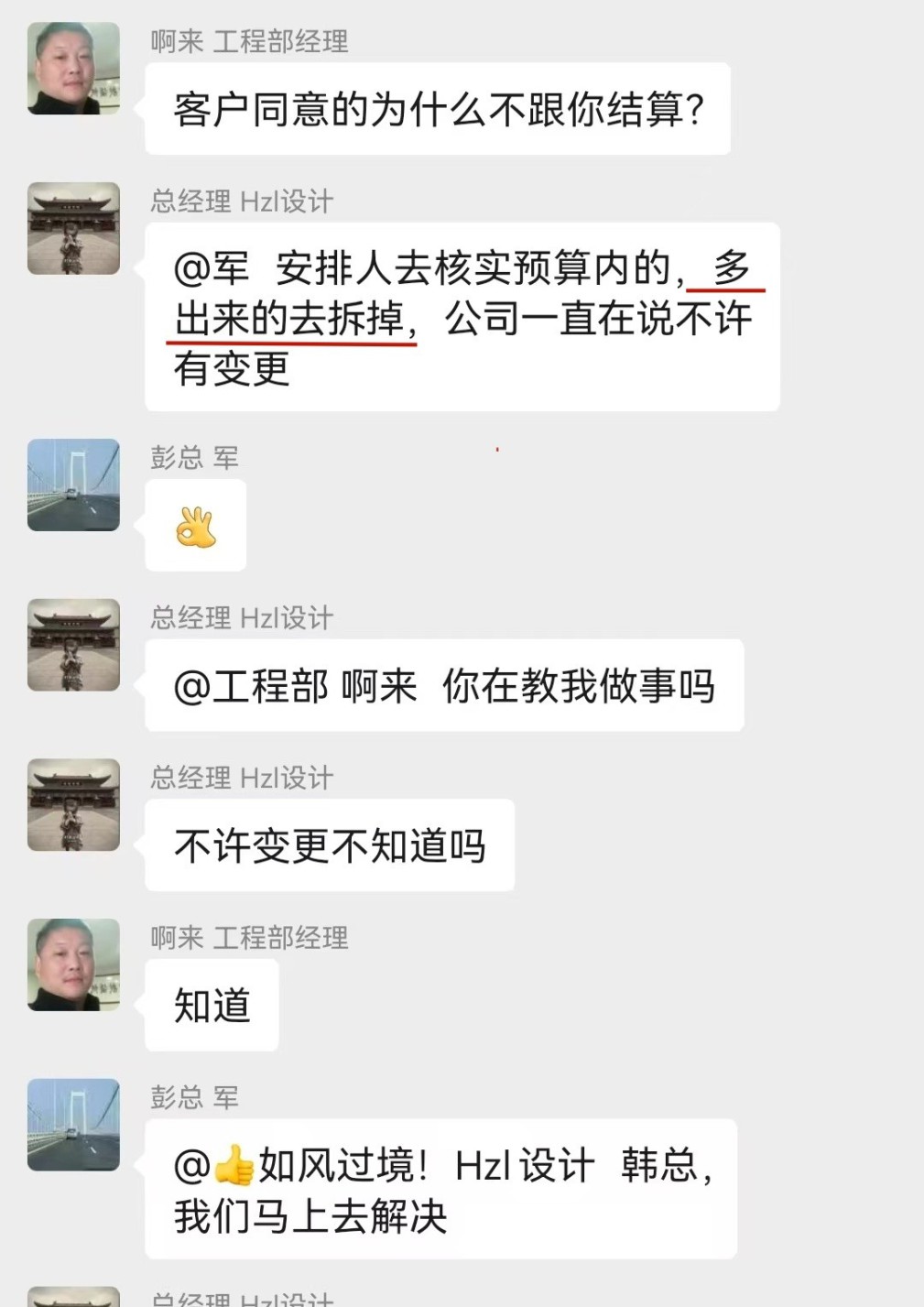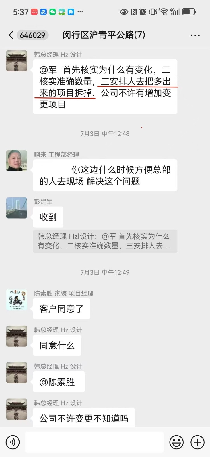 群里工程部經(jīng)理啊來說鉑墅(上海)空間設計裝飾有限公司總經(jīng)理來現(xiàn)場解決問題,等了近一周,至今未來未回復,不了了之。