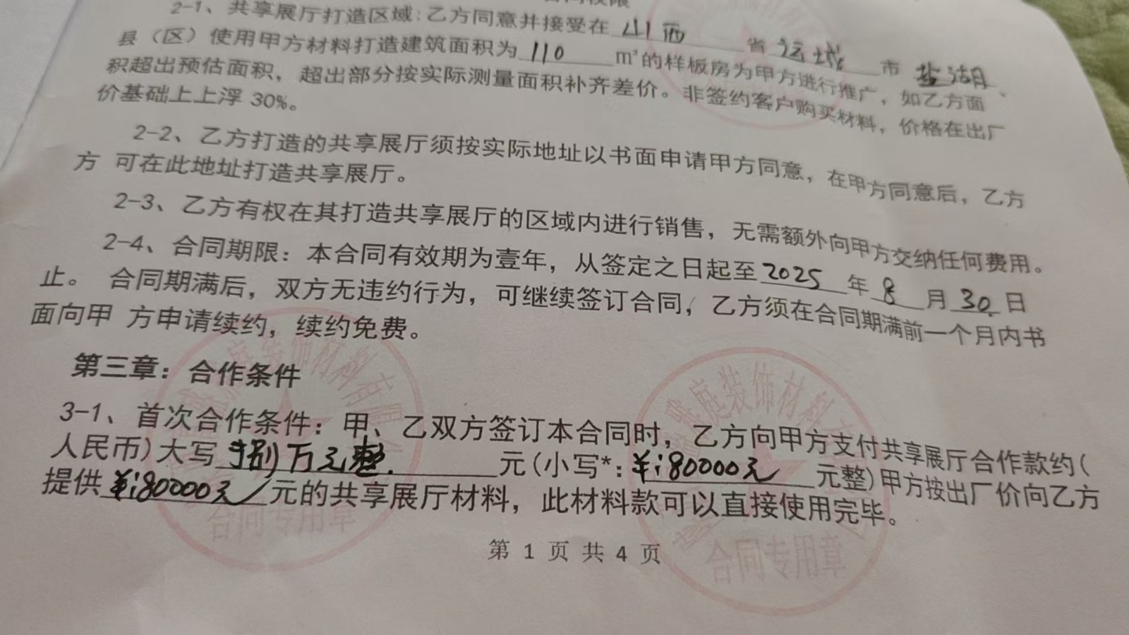 8月10日左右,我與家人前往考察,業(yè)務(wù)周總接待時稱材料合規(guī)、價格低于出廠價,我們當(dāng)時問我們當(dāng)?shù)赜袠影彘g嗎,說沒有,說我們做樣板間,在展示樣板房并承諾:除水電外全屋整裝(墻面、衣柜櫥柜、衛(wèi)浴燈具等,額外贈送瓷磚,依效果圖施工,顧客付款驗收即可入?。浰痛昂?、沙發(fā)、品牌家電等軟裝,明確物流、運(yùn)費(fèi)、工期等細(xì)節(jié)。還提出樣板房每參觀一次給 100 元,介紹客戶有 10% 返利。最終約定總價 8萬元,回家15日支付1萬元意向金。