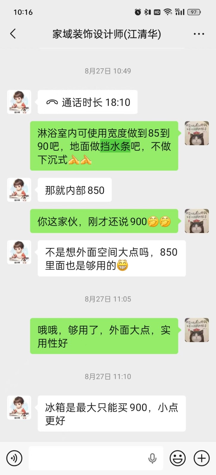 2、關(guān)于衛(wèi)生間擋水條之事。家域公司認為擋水條不在合同清單中,需要增項由我方出資購買。我方認為,簽約前我已通過微信發(fā)送需求給設(shè)計師,明確不采用下沉式,而采用擋水條方式裝修淋浴區(qū)(詳見附后微信截圖),我有理由懷疑這又是一次在簽約時故意漏項,壓低合同價格,事后采用增項的方式讓我方買單的惡意行為,對此增項我方不予認可。