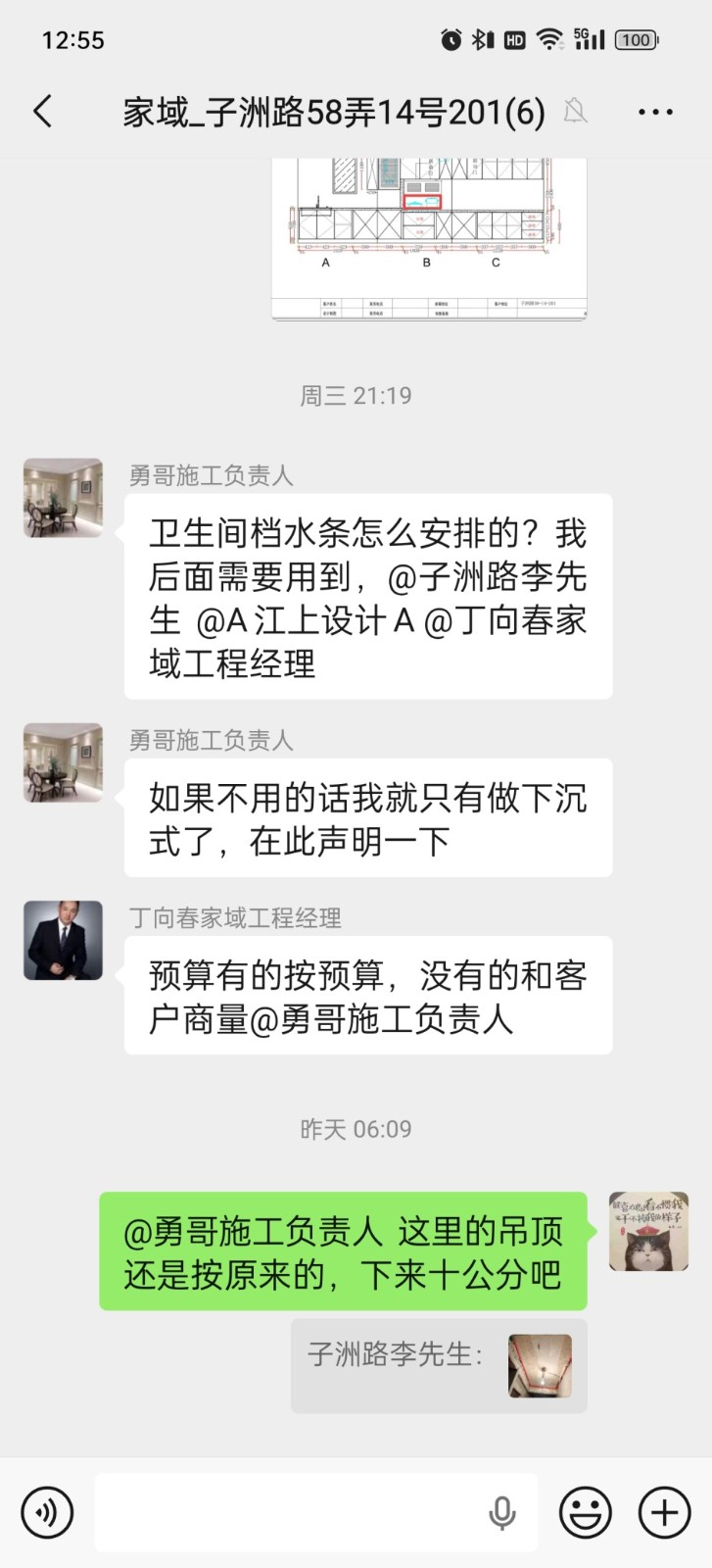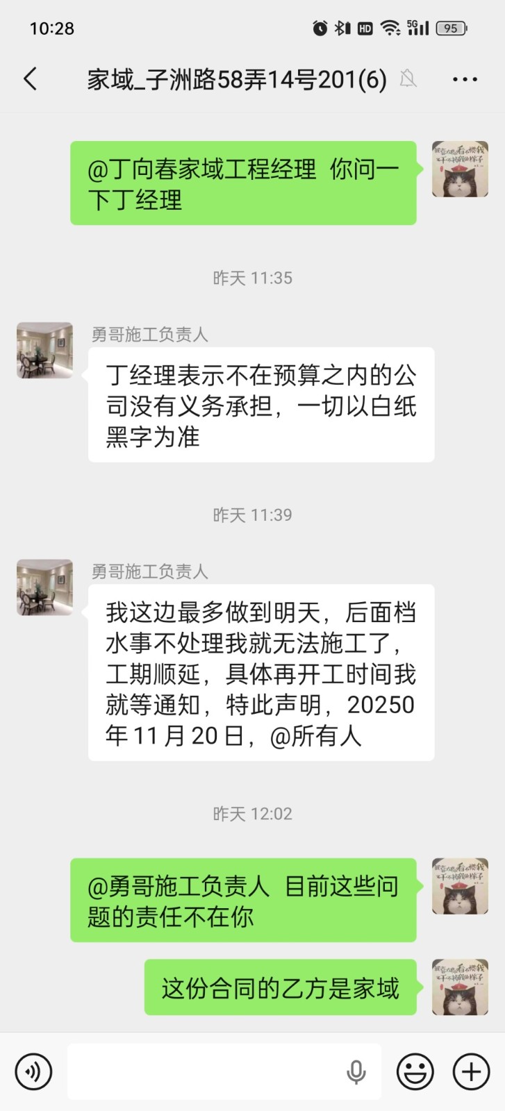 5、關(guān)于家域公司的對增項的操作導致我方與施工隊關(guān)系惡化一事。由于家域公司未正確處理增項糾紛,在不承擔增項費用的前提下,要求施工隊工長自行與客戶商量解決(詳見附后微信截圖),導致目前工長因缺少擋水條不得不停工,并對之前承諾為我方定制走廊儲物吊頂之事產(chǎn)生為難情緒,對此我方要求家域公司正確對待并處理此次增項糾紛,不要將責任轉(zhuǎn)嫁他人,導致糾紛進一步擴大。