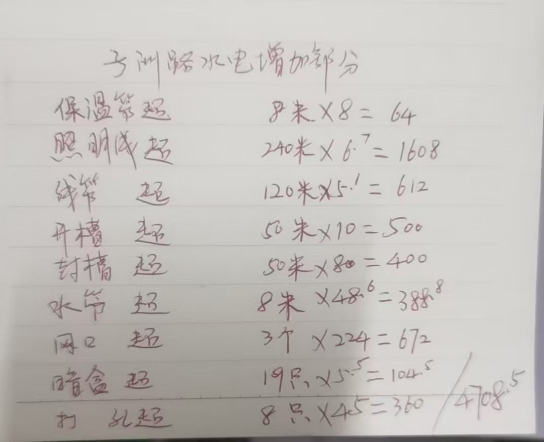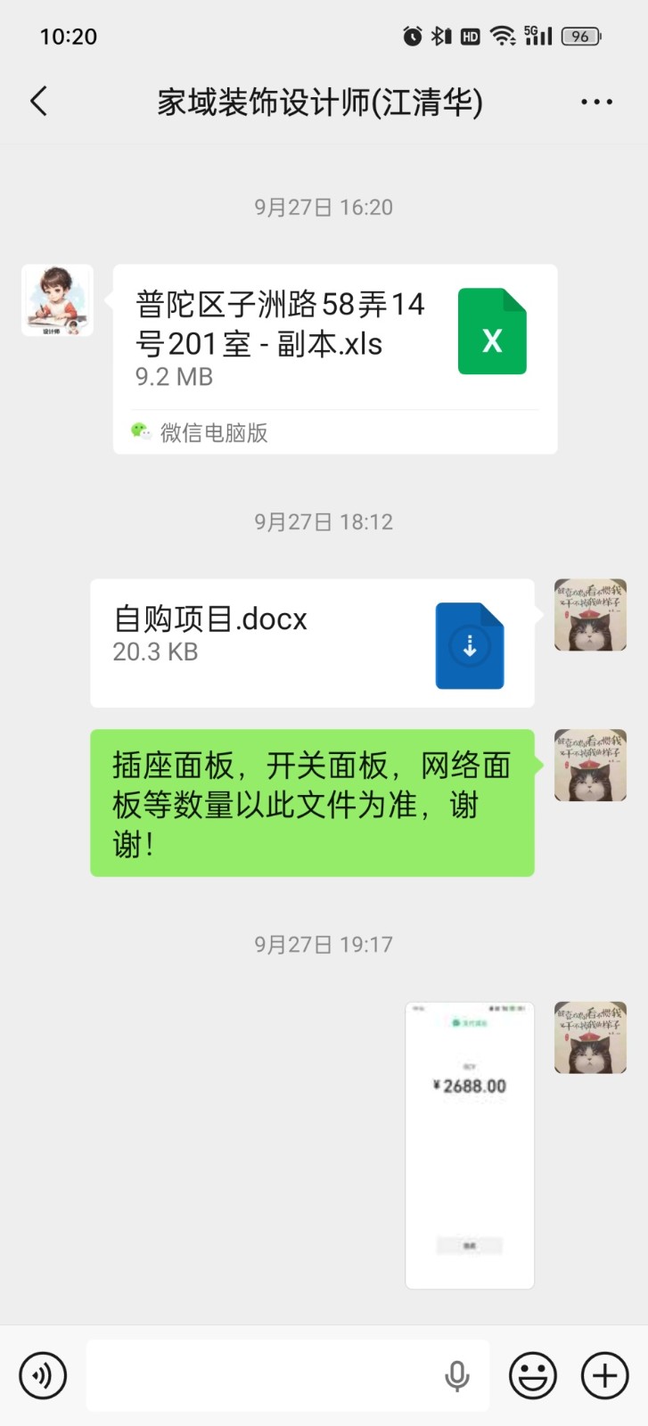 1、關(guān)于水電增項一事。家域公司要求我承擔水電增項費用4708.5元(詳見附圖)。我方認為,根據(jù)《補充協(xié)議》和監(jiān)理《陪簽記錄表》約定(詳見附圖):“在設(shè)計圖紙或施工項目未變更的前提下,合同總價為閉口,視為已包含全部工程量,增項超過合同價的部分由乙方承擔”。且簽約前我已通過微信發(fā)送《自購項目》文檔給設(shè)計師(詳見附后微信截圖),其中詳細說明的插座和開關(guān)的位置及數(shù)量,我有理由懷疑這是在簽約時故意漏項,壓低合同價格,事后采用增項的方式讓我方買單的惡意行為,對此增項我方不予認可。