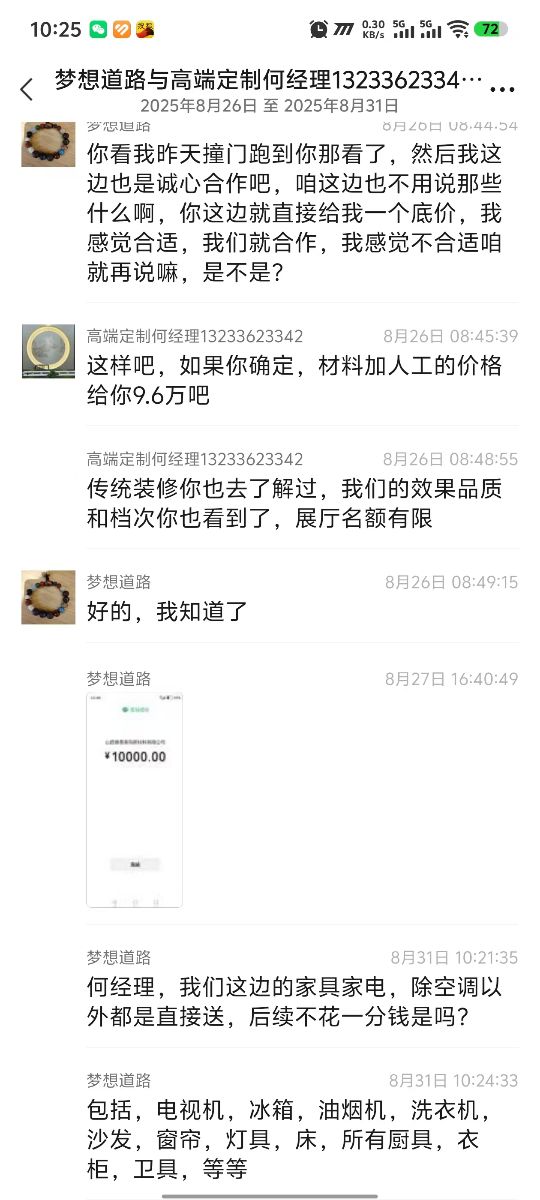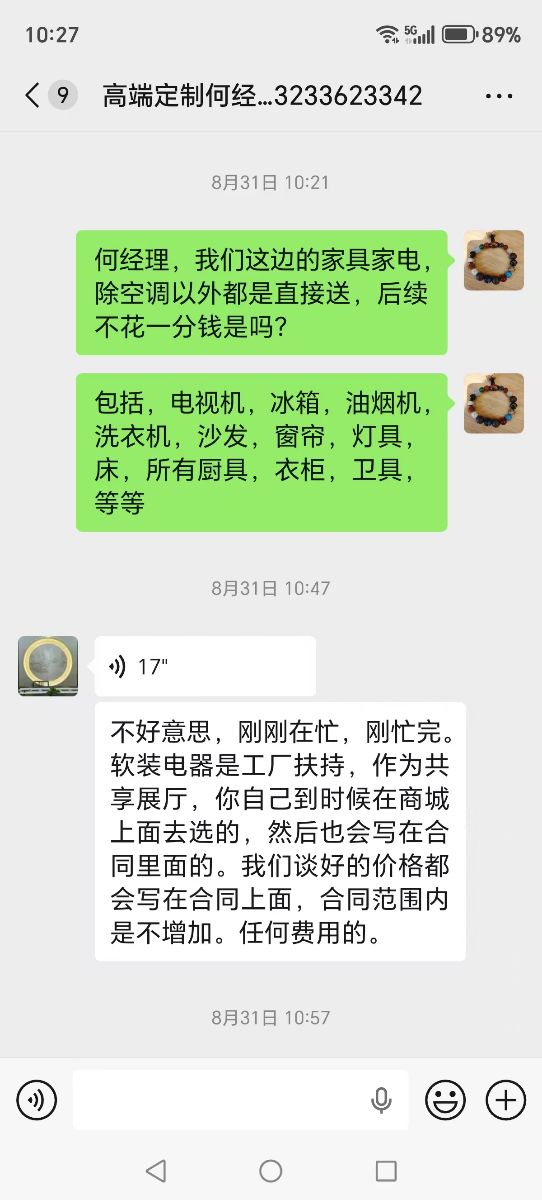 初期流程順利,量房、出效果圖都很快。但準(zhǔn)備運(yùn)材料時,公司讓我墊付運(yùn)輸、搬運(yùn)及木工安裝費(fèi)。我質(zhì)疑為何額外掏錢,給對方溝通后,他說讓我先墊付,隨后結(jié)尾的時候會退給我,等到做衣柜的時候他就打電話問我要錢,說我的材料款不夠了,再次讓我交錢,我立馬就和我對接的何經(jīng)理電話號,結(jié)果根本打不通,到現(xiàn)在是電話不接,微信不回,