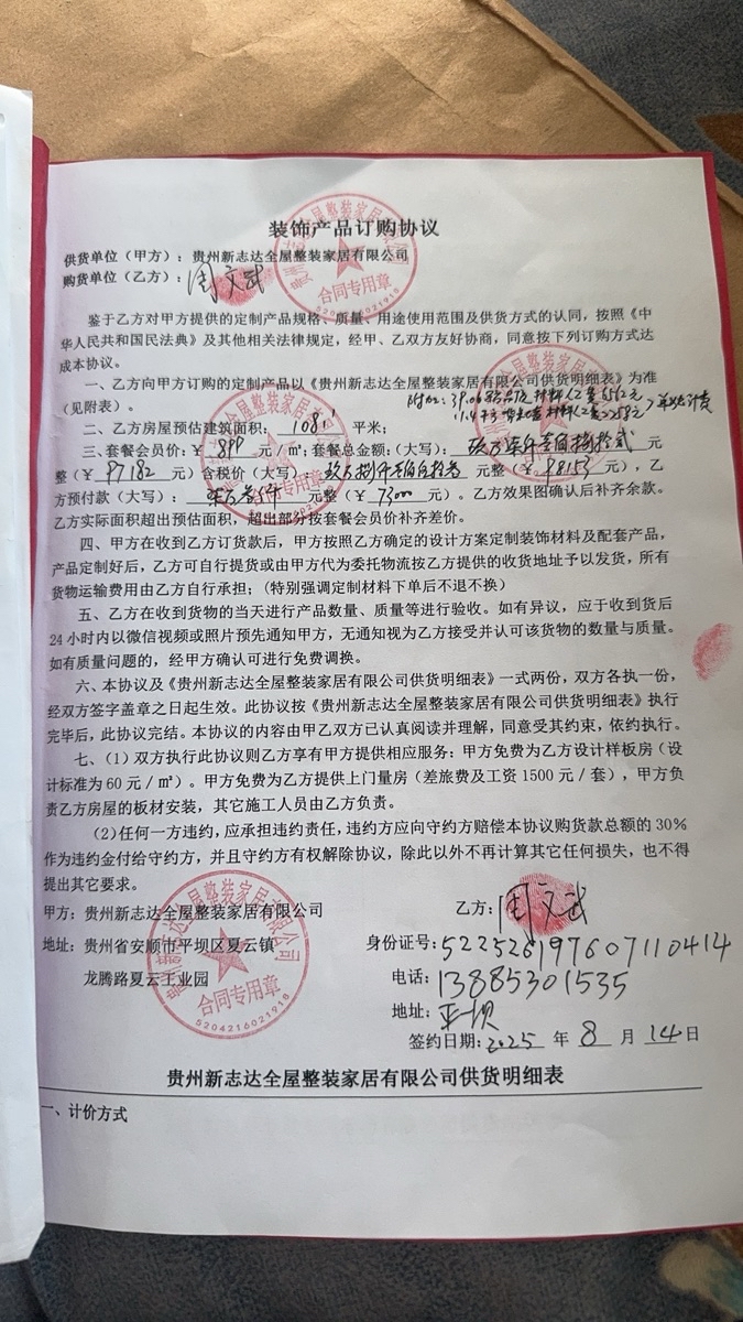 2025年8月,我在抖音刷到貴州新志達(dá)全屋整裝廣告,“幾萬元即可實(shí)現(xiàn)全屋整裝拎包入住”的宣傳讓準(zhǔn)備裝修的我動(dòng)了心。很快,公司工作人員主動(dòng)聯(lián)系我,態(tài)度格外熱情,把服務(wù)夸得盡善盡美,反復(fù)邀請(qǐng)我去工廠實(shí)地考察。8月14日,我和家人專程趕到他們工廠,毛經(jīng)理全程接待。他帶我們參觀了樣板間,當(dāng)場明確承諾:全部包含-墻頂、墻面、地磚、全屋柜子 一站式搞定,還贈(zèng)送家具家電和窗簾,確保真正拎包入住。沖著這份明確的承諾,我們談好總價(jià)10萬元,當(dāng)場支付了2萬定金 付完定金后第二天馬上上門量房 出設(shè)計(jì)圖 當(dāng)時(shí)覺得他們還很可靠。出完設(shè)計(jì)圖后。事情完全變了樣。一段時(shí)間后,公司要求付合同款款50% 馬上排單 后面又付了5萬。公司只發(fā)來墻頂、墻板、地磚等基礎(chǔ)材料,就要求我自行買輔材。為了不耽誤裝修進(jìn)度,我無奈墊把輔材全部買了。好不容易完成板材安裝 我聯(lián)系公司準(zhǔn)備下一步施工時(shí),卻被潑了一盆冷水:若想繼續(xù)做櫥柜等后續(xù)項(xiàng)目,必須再支付后面尾款才能 能發(fā)材料。不付尾款連下一步對(duì)接柜子尺寸都對(duì)接不了。 后面 因?yàn)椴幌氲⒄`工期。無奈又把尾款打完 打完尾款之后 開始對(duì)接柜子。完了 對(duì)接柜子 要我補(bǔ)5萬左右塊錢 才能幫我做完。他們居然說全屋整裝只包了20幾個(gè)平方柜子。我的柜子超了80多平方 580/平 還需要支付超出平方后的金額 才能做完 這與當(dāng)初“全包拎包入住”的承諾完全相悖,我當(dāng)場拒絕了這一無理要求。之后我多次與公司負(fù)責(zé)人溝通,始終沒有結(jié)果。目前我的訴求,就是要求退50000元,