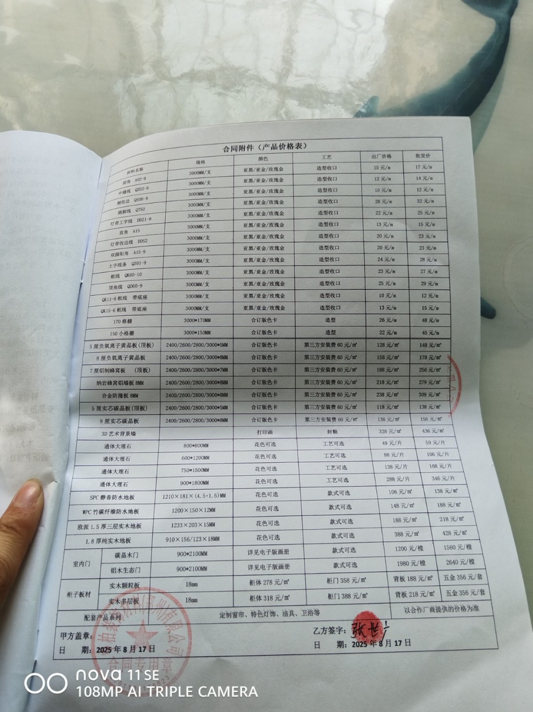 截至 11 月 25 日,僅發(fā)來(lái)瓷磚、墻面吊頂,辛經(jīng)理稱(chēng)柜子只裝 20㎡、門(mén)僅 2 個(gè),其余需加錢(qián),燈具安裝不管,且材料價(jià)遠(yuǎn)超市場(chǎng)價(jià) 4-5 倍(如金剛板墻面吊頂市場(chǎng)價(jià) 30 元 /㎡,總材料成本不足 2.5 萬(wàn)元);