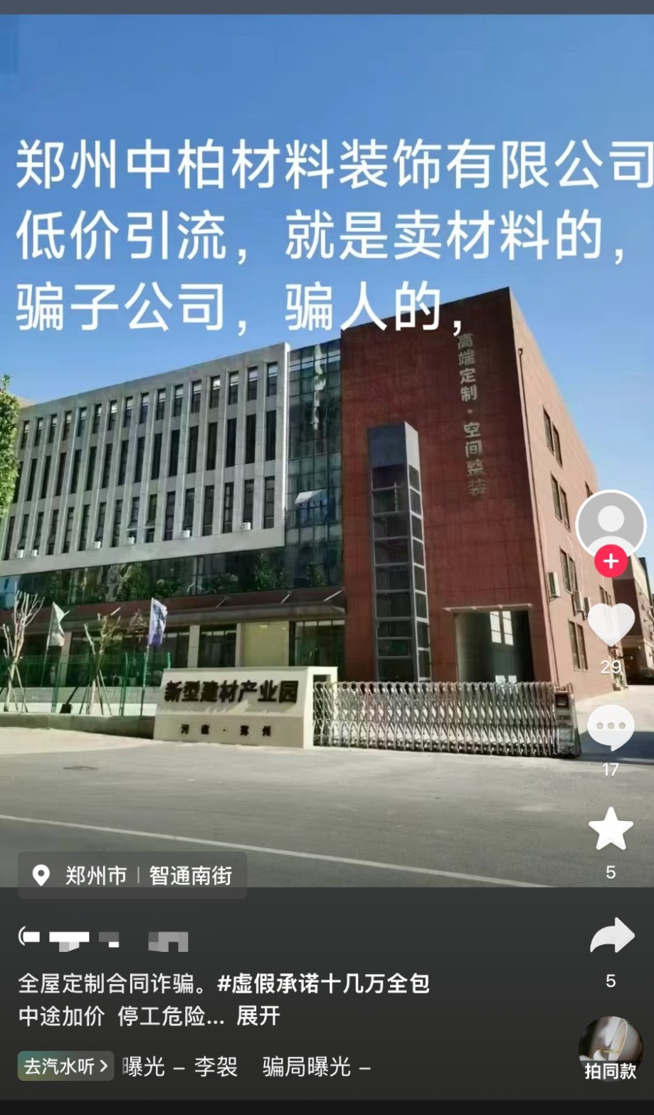 揭穿中柏裝飾材料(鄭州)有限公司整裝騙局