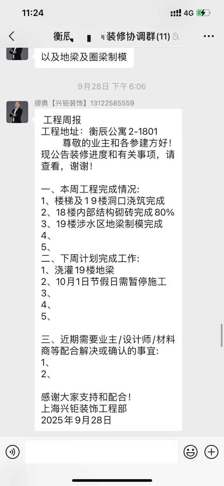節(jié)前把樓梯都澆筑好了, 新砌墻也是按照標(biāo)準(zhǔn)新老墻必須植入鋼筋 , 圈梁也是必須要有的 ,只有規(guī)范施工嚴(yán)格把控才能筑造好的品質(zhì) , 每天的工作匯報和周總結(jié)匯報少不了 , 讓業(yè)主時刻了解工地進(jìn)展 , 及時了解現(xiàn)場狀況, 更好的銜接和溝通 , 辛苦現(xiàn)場的每一位管理人員和工人師傅 , 感謝上海裝潢網(wǎng)邱老師和楊老師現(xiàn)在指導(dǎo)和監(jiān)督。