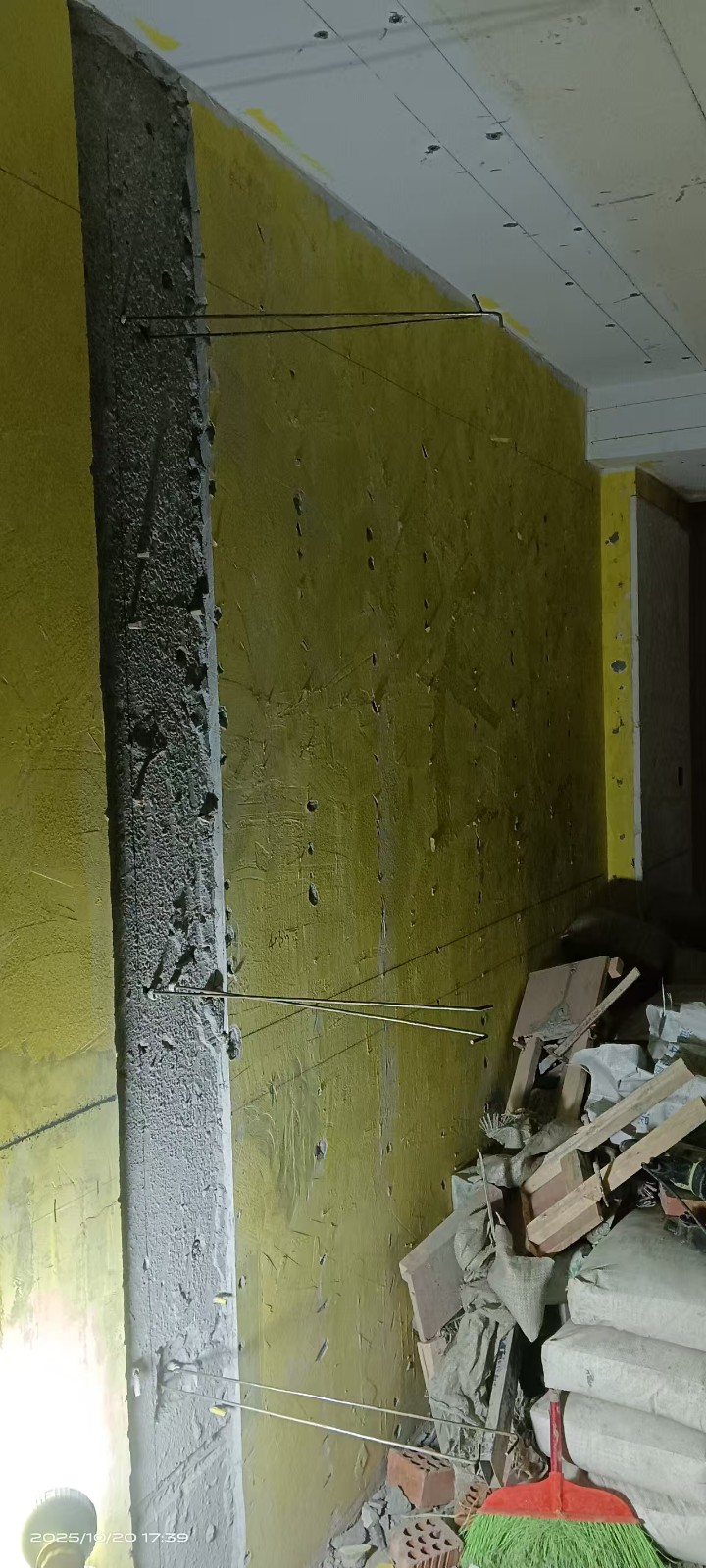 保留結(jié)構(gòu)鋼筋需用角磨機(jī)切斷,門洞上方增設(shè)槽鋼支撐防止墻體下沉。