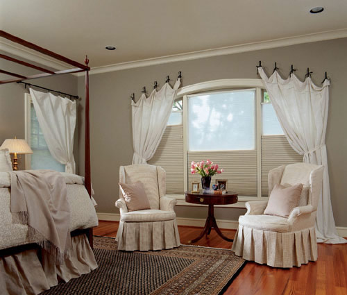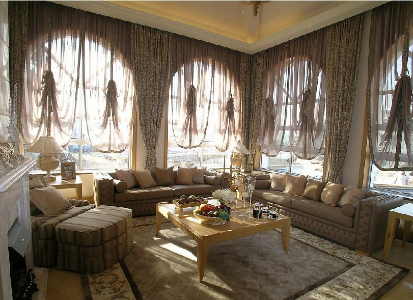 客廳是用于會友待客的重要場所,廳內的布置表示著熱情的主人對客人的友好之情,選擇一款質地豪華、造型精美的落地式布藝窗簾會讓客廳更顯大方、氣派。因此淺色調、透光性強的薄布料是合適的選擇,用這種布料做窗簾可營造出一種莊重簡潔、大方明亮的視覺效果。