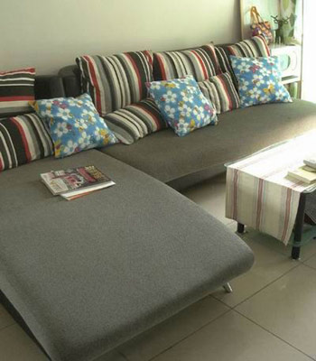 扮家心得:家是點滴積累的,平時多逛逛家居商場,多積累些小飾品比較好,一次性購買往往會時間太緊迫。 L型沙發(fā)加條紋抱枕共1500元,原價2800,樣品再砍價,1500就拿到了,當(dāng)時買得比較急沒有細選,覺得占面積太大了,但是大有大的好處,橫七豎八都可以躺。