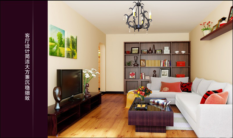 空間雖小,客廳簡(jiǎn)潔大方中顯沉穩(wěn)細(xì)致??蛷d整體格局略顯狹長(zhǎng),所以沙發(fā)的選擇比較簡(jiǎn)潔,大小適中。色彩搭配冷暖皆含。