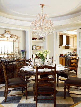 古典韻味十足的吊燈,別致的窗飾背景。在滿是實木餐桌椅的餐廳里顯得雍容華貴。硬硬的木頭在寒冷的冬天很多人都不喜歡,在美式風(fēng)格里,這樣的椅子會是皮質(zhì)的柔軟座墊。真的可以做到冬暖夏涼。