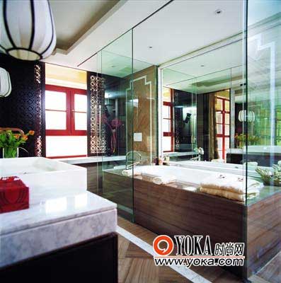 厚重的石材與輕盈的玻璃讓衛(wèi)浴間充實(shí)而簡(jiǎn)潔,沒(méi)有過(guò)多的裝飾,而用中式的雕花窗扇來(lái)營(yíng)造濃郁的浪漫風(fēng)情。透過(guò)雕花斑駁的光影,原本直白的光線變得富有情調(diào),簡(jiǎn)練與柔媚,兩種不同的風(fēng)情因?yàn)殛?yáng)光的融入,巧妙地結(jié)合在一起。而木質(zhì)窗扇既不怕水又能透光,是布藝窗簾所不能比及的。