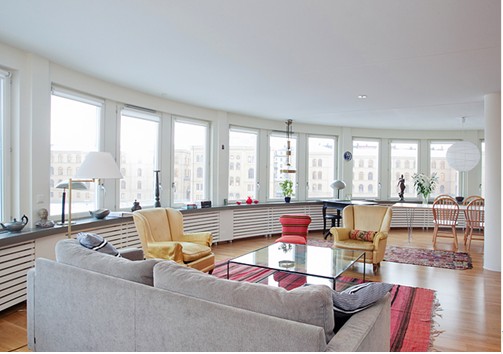 開放式表現(xiàn)在一個大面積的半圓形空間,朝陽的16扇窗戶整齊地沿圓弧劃過一個半圈,內(nèi)里灑滿陽光。