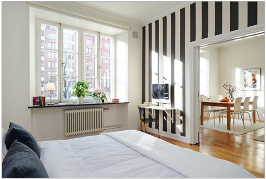 臥室,黑白間條設(shè)計(jì)占據(jù)了半個(gè)房間。白色的電腦桌色釘在墻上的,電腦就像沒有支撐地浮在半空中一樣。陽(yáng)臺(tái)上的空間可以放書和綠色盆栽,豐富了以黑白為主的房間的色彩。