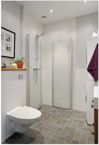 全透明的淋浴間讓浴室的空間看起來更寬敞。代替?zhèn)鹘y(tǒng)的落地坐廁,和墻壁相連的坐廁顯得嬌小玲瓏,非常別致。用四格漫畫裝飾廁所的墻壁,讓純白色的廁所多了一點(diǎn)童真和浪漫。