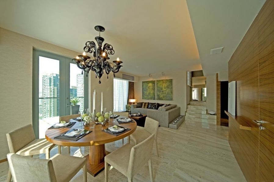概要: 餐廳與客廳連著臥室的幾階大理石樓梯,淡淡的明黃色墻面,灰白的瓷磚地面,簡約的線條形成這一幅現(xiàn)代感十足裝飾圖。雖然客廳與餐廳是相連在一起的,卻又可以輕易區(qū)分開來,兩扇開闊的落地窗使空間采光非常豐富,坐在餐桌上就餐亦可以欣賞窗外的繁光?! 〔蛷d的另一面是開闊的室外陽臺(tái),兩面都是落地窗,這個(gè)餐廳不謂不是風(fēng)水寶地。餐桌上方的吊燈歐式造型,多了一點(diǎn)浪漫的味道。