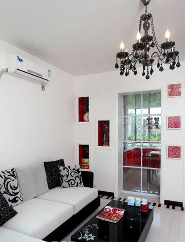 客廳與廚房之間的地面,用了很流行的琴鍵鋪法處理瓷磚。很有質(zhì)感的茶幾與黑色吊燈相互映襯。墻面紅色裝飾打破黑白冷艷的客廳,增加一絲暖意。