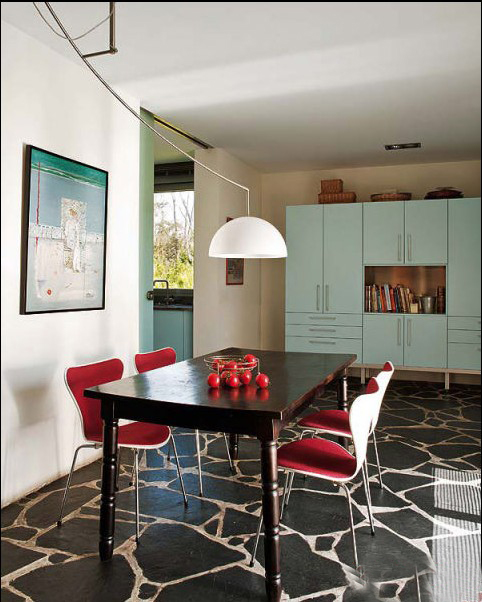 一個(gè)舊舊的木質(zhì)餐桌配紅色的座椅,讓人看著就覺得不侖不類。不過,這就是MAIK,他喜歡,他說坐在上面吃飯才有心情。