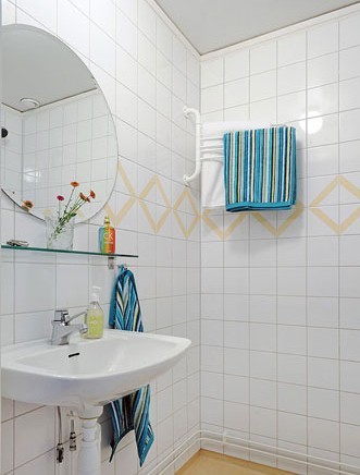 衛(wèi)浴空間的設(shè)計(jì)簡潔而明快,體現(xiàn)了現(xiàn)代人的品味。清新的藍(lán)色、黃色點(diǎn)綴呈現(xiàn)出清爽明凈感,小部分花磚的墻面拼貼在細(xì)膩中展現(xiàn)出不凡的品質(zhì)感,營造出純凈的自然氛圍。擱架的處理提供了良好的收納裝置,是裝飾,也是實(shí)用家品。讓空間顯得非常舒適。