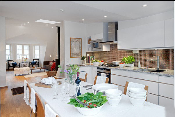 開放式的廚房很能挑戰(zhàn)主婦的清潔力度,這里白色的櫥柜同馬賽克的花色形成了鮮明的對比。