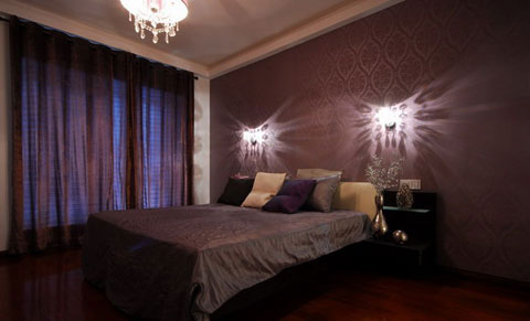 深紫色的臥室在水晶燈的照應(yīng)下十分夢幻,整體效果奢華時尚。