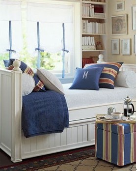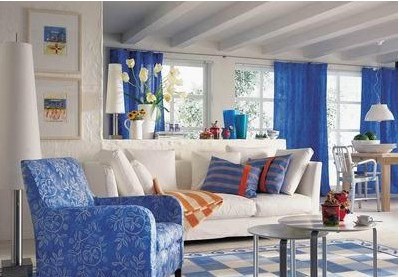 以地中海地區(qū)的地域劃分,地中海風格大致有三個典型的顏色搭配藍與白:從西班牙、摩洛哥海岸延伸到地中海東岸的希臘,西班牙那蔚藍海岸與白色沙灘、希臘的白色村莊在碧海藍天下閃閃發(fā)光,而村莊、沙灘和碧海、藍天連成一片,一切就像在夢中一樣。就連門框、樓梯扶手、窗戶、椅面、椅腿都會做成藍與白的配色,加上混著貝殼、細沙的墻面,小鵝卵石地,拼貼的馬賽克,金、銀、鐵的器皿,都將藍與白不同程度的對比與組合發(fā)揮到極致。