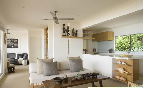 這踏踏米式的沙發(fā),在這個半開放式的廚房吧臺旁邊,餐桌在另一角,轉(zhuǎn)角過道都設計成了柜子做為收納空間。