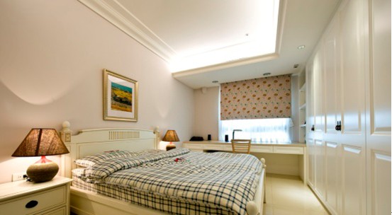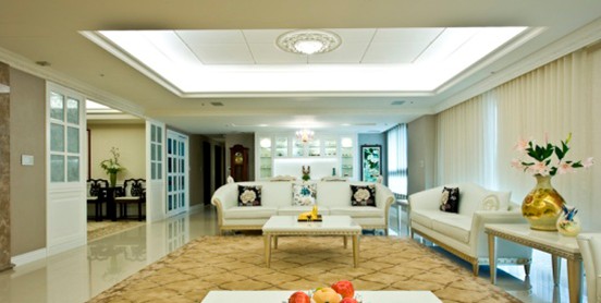 歐式中的白色家具是所有裝飾中比較洋氣的,也是比較討巧的裝飾,白色是神圣典雅的;白色大尺寸石膏頂角線條,局部白色吊頂燈帶,具有不對稱的美感;