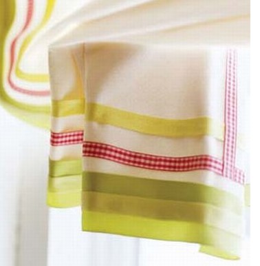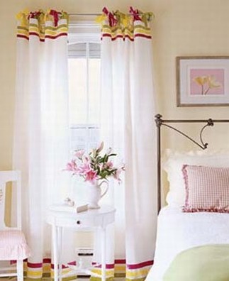 概要: 很多人為選窗簾發(fā)愁,只有好看的布料,卻不知道如何獨(dú)出心裁。不用跑到裁縫店,也能親手制作出漂亮而具個(gè)性的窗簾裝飾?! ?。垂地吊帶窗簾 3種不同的水果色調(diào)天鵝絨絲帶使平白的布環(huán)窗簾變?yōu)檠胖碌难b飾?! 》椒ㄈ缦拢悍牌酱昂?,條紋絲帶水平方向用織物膠水粘好。制作窗簾的頂部扣環(huán),先把吊帶剪下來(lái),然后在每個(gè)窗簾上剪出6個(gè)間距相等,2。