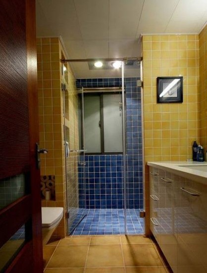 衛(wèi)生間里的墻磚和地磚統(tǒng)一顏色,均為復(fù)古磚。淋浴房和盥洗區(qū)分別用藍(lán)色和黃色瓷磚區(qū)分開(kāi)來(lái),使得空間區(qū)域隔斷明顯,容易辨認(rèn)。干濕分區(qū)對(duì)家庭主婦來(lái)說(shuō)太重要了。