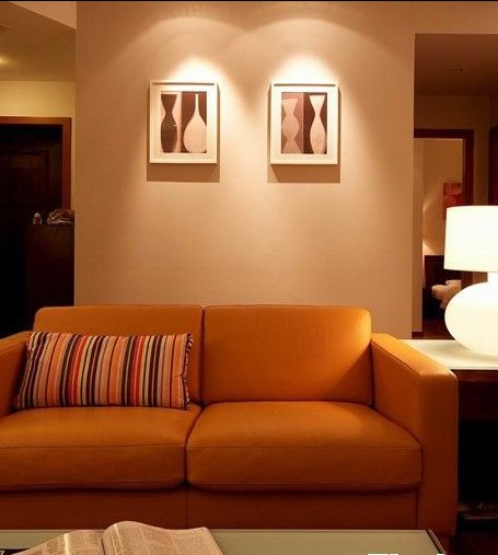 沙發(fā)的一角臺(tái)柜上的臺(tái)燈通體的白,點(diǎn)亮之后就看不出燈泡在什么地方,渾然一體。背面的墻壁上兩幅藝術(shù)作品位置剛好被兩盞燈直射,感覺(jué)像在畫(huà)展里欣賞一般。