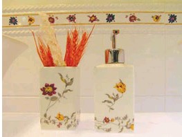 肥皂碟、牙刷杯等洗漱用品可以變成藝術(shù)品?你難以想象。然而,設計師就有足夠的想像力將它們演繹成陶瓷藝術(shù)品。肥皂碟呈現(xiàn)一個小小的扁圓形,有意思的是位于扁圓形中央的圖案設計?D?D?D一張自然攤開的紅楓葉,看上去就像秋天楓樹上不經(jīng)意間落下的一片楓葉,悄悄地在一個陶瓷小碗上安了家。楓葉的紅,陶瓷制品的晶瑩剔透,兩者融合在一起,確實給予衛(wèi)生間一種別樣的美感。