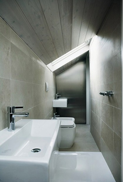 狹長的衛(wèi)浴間空間,純白的潔具與四周略顯灰色的墻壁形成強(qiáng)烈的色彩對比,銀白色水龍頭與日光燈點(diǎn)綴緩解了空氣中的沉郁氛圍,簡單的浴具擺設(shè)和墻壁磚營造幾何線條魅力,簡約中不是高貴,富有時代氣息。