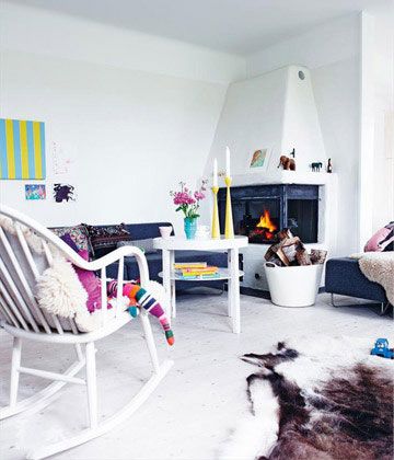 墻面與地地板都選用了白色,搭配的色彩相當(dāng)?shù)暮啙崳@大范圍的運用了白色,讓人感覺置身于寒冷的北歐,看看這歐洲風(fēng)格的壁爐給這簡潔的家加分不少,還有毛絨的地毯與椅墊,讓人感覺這家溫暖了許多。