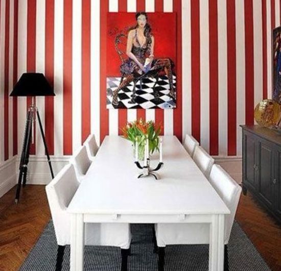 到了以熱情如火的紅色為主題的空間—飯廳了。紅白相間的壁紙,表達紅色的熱情之余,用白色的冷靜來平衡調(diào)和,減低紅色給人的壓迫感,同時也是另一個白色空間的過渡。值得注意的第一點,是壁畫的選擇,壁畫上的黑白地板瓷磚是不是很熟悉呢?