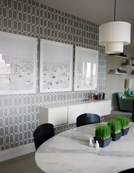 飯廳的位置則貼上了灰色、白色相間的蜂巢狀壁紙,用掃描畫加以裝飾加上白色儲物柜,隔開大塊的白**塊,將眼花繚亂的壁紙變得更加合理。大理石餐桌上灰色的石紋,更近一步地將“灰色“演繹得淋漓盡致。搭配桌上綠色小盆栽,營造淡雅自然的飯廳,人在享用餐飲的時(shí)候能更加放松心情。