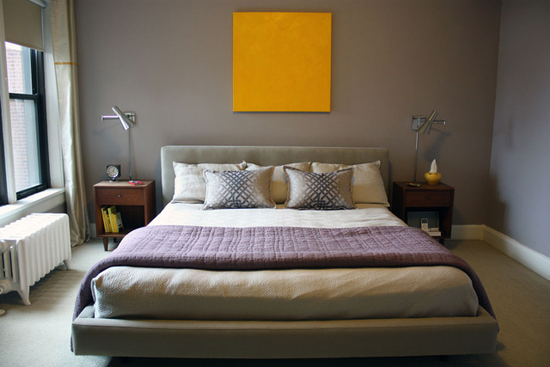 寢室和其他空間一樣,用灰色奠定了裝修的主基調(diào),墻壁、床架、被套、抱枕、地毯都是或深或淺的灰色。在一大片灰色的空間,用鮮黃色放在床頭側(cè)墻壁的正中央,給人以輕松樂觀的積極向上感,也將人的視線迅速聚集到一個(gè)焦點(diǎn)。