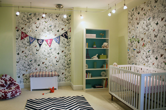 用灰色線條加上五顏六色的蝴蝶裝飾的壁紙將米白色的嬰兒房墻壁營造出清新自然又開闊的空間。加上黑白波浪花紋的地毯,將平面變成立體的設(shè)計(jì),增加顏色和設(shè)計(jì)的層次。書柜里側(cè)的藍(lán)色則保持了客廳和寢室顏色上的聯(lián)系。