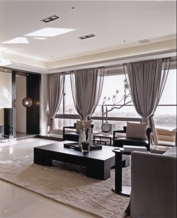本案以簡(jiǎn)約舒適為基底,同時(shí)加入美式古典風(fēng)。玄關(guān)采用大理石鋪地,設(shè)計(jì)師將原設(shè)計(jì)圖的黑白根大理石換成層次低調(diào)的木化石堆砌,并以削光手法處理以降低石材反光度,而玄關(guān)延伸而出的大理石則在低矮機(jī)柜起始,向客廳落地窗及書房延伸。設(shè)計(jì)師巧妙地以家具帶出空間的柔軟度,混搭性的裝飾古典線條從落地窗簾到沙發(fā),層層害顯空間品位。透過(guò)造型燈具的選用,不僅取代主燈光源,也讓空間更富味道。