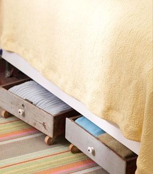 拿舊柜子里的抽屜做收納盒,在五金件市場里購買小輪子為其裝上,附在底部的滾輪可以讓它更加自由靈活的移動。