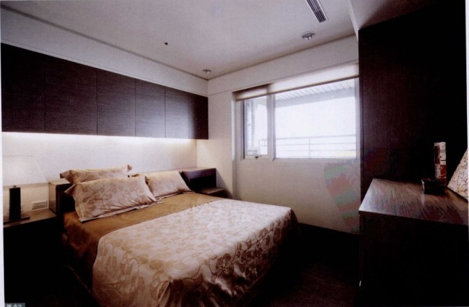 臥室的床頭上方有壓梁的問(wèn)題,設(shè)計(jì)師在此配置了吊柜,將梁柱隱藏起來(lái),吊柜下方安裝燈光,減輕柜體的重量感,讓臥室更加舒適。