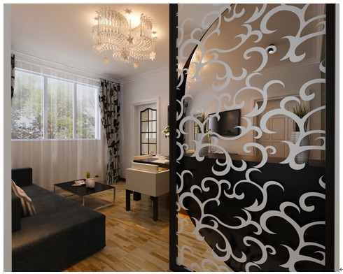 這個視角是本案例的一個重窗戶這個視角看整體布局的一個場景視角,主色調(diào)是黑白灰,因為是現(xiàn)代風(fēng)格所以沒有比較的復(fù)雜的裝飾造型,墻頂面上是走的石膏角線,因為房子的層高不是很高,所以吊頂會顯得比較的壓抑!沙發(fā)背景上的3副黑白掛畫在與白色的墻面的對比詮釋出黑白色調(diào)的搭配性,進門的玄關(guān)及鞋柜藝術(shù)鏤空花格進門的美觀性很強,分開了走道及客餐廳的區(qū)域,使得空間規(guī)劃的更規(guī)范性,