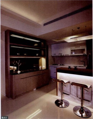 燈光運(yùn)用是創(chuàng)造空間層次感的關(guān)鍵,特別是由下往上打的間接燈光,能夠營造氣氛。吧臺與餐邊柜的間接燈光,成為營造生活氛圍的最佳幫手。