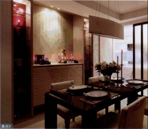 有些人家里會擺放財(cái)神或者信仰之類的,這一向是空間最難與居家風(fēng)格搭配的區(qū)域,通常會隱藏方式來處理,設(shè)計(jì)師決定以現(xiàn)代手法讓它們?nèi)谌肟臻g,于是在天花板上方加裝換氣扇,并將貼有心經(jīng)經(jīng)文的磨砂玻璃為背板,臺面下則設(shè)計(jì)了抽板取代一般的八仙桌,而祭拜需要的器具放在兩側(cè)的收納柜中,平時(shí)只要將拉門拉上既可隱蔽雜物。