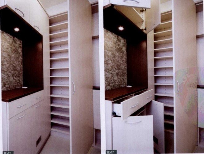 空間小,采光便很重要。因此在玄關(guān)處利用造型玻璃,避免一進(jìn)門即見到客廳的視覺尷尬。玄關(guān)走道的另一側(cè)以茶鏡處理,讓原本狹長的玄關(guān)走道空間放大。由于墻壁埋有配電箱及對講機(jī)而不平整,設(shè)計師利用系統(tǒng)柜將其規(guī)劃為整面的收納空間,讓所有物品盡納其中。找開玄關(guān)處所有的柜門,會發(fā)現(xiàn)內(nèi)藏乾坤,大大小小的格子空間可以置放不同規(guī)格的鞋子。