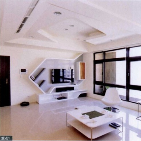 偌大的空間以白色為主色,避免空間過于單調(diào),設(shè)計師特別設(shè)計了個性化的電視柜,并以對稱的天花板作為呼應(yīng),成為空間視覺的焦點(diǎn)。造型別致的電視培與客廳的簡約茶幾沙發(fā)相搭配為我們營造一個簡約又不失時尚感的客廳。