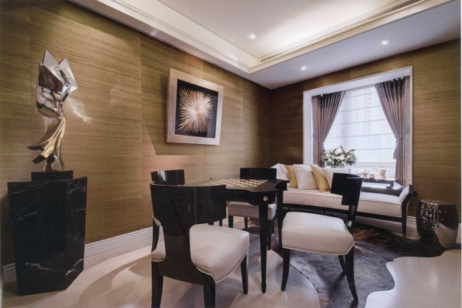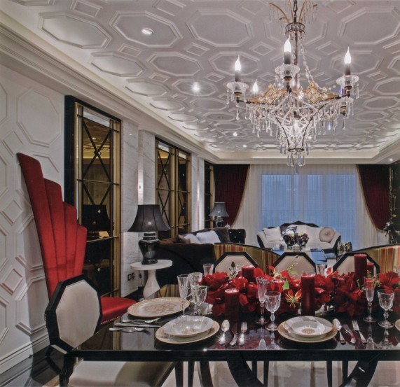 六角形的浮雕效果天花,繼續(xù)延伸到餐廳主墻,強調(diào)立體而別具個性的空間感。新古典優(yōu)雅而繁復的桌椅造型,強調(diào)質(zhì)感而非雕梁畫棟的裝飾家飾,反而更凸顯了整體空間的奢華感。